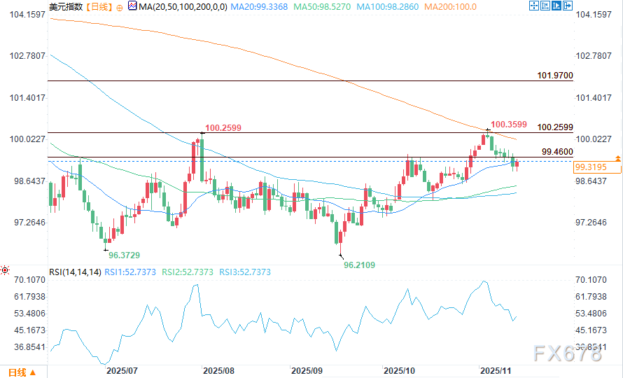 汇通财经APP讯——周五(11月14日)美盘时段,美元指数在守住周四98.991的盘中低点后,小幅回升至99.30附